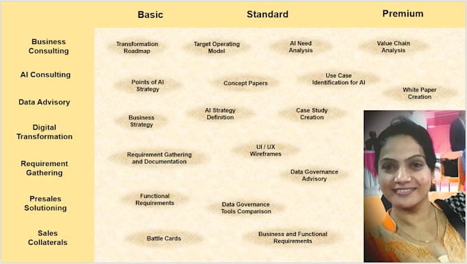 This offering is designed to provide a complete Business Requirement Document, covering needs in Business Intelligence (reports, KPIs, and value creation), Data Governance (tools, requirements, and organization), Artificial Intelligence (use case identification, technology recommendations, and value creation across the chain), IOT and connected devices (data flow creation, identification, and integration), and Business Problem analysis (identification, problem statement formulation, and linkage to key Business Requirements).