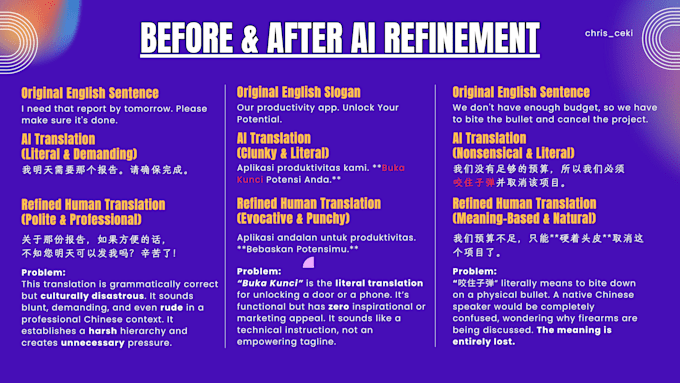 Are the translations from AI tools such as ChatGPT, DeepL, or Google Translate sounding robotic, unnatural, or slightly incorrect? Avoid damaging your brand's reputation with imperfect AI content. While AI is a powerful instrument, it often lacks the crucial grasp of context, culture, and style required for effective professional communication.